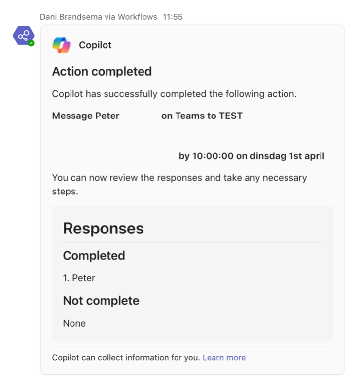 De actie zorgt ervoor dat iedereen automatisch een bericht in Teams krijgt. Ook ontvangen zij nog een herinnering 3 uur voor de deadline wanneer zij de survey op dat moment nog niet hebben ingevuld. Ik ontvang de reacties netjes in een bericht in Teams, zonder dat ik handmatig hoef te mailen of reminders te sturen. Een kleine moeite, groot gemak.
